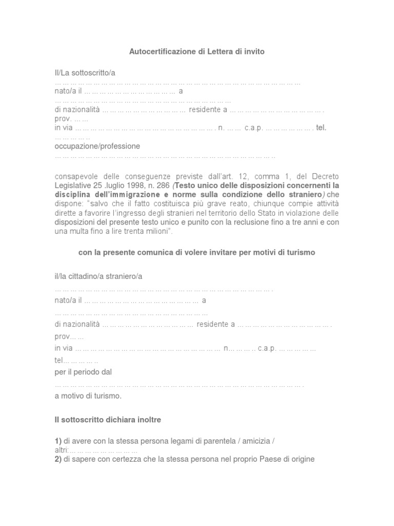 Dichiarazione di ospitalità modulo 2022 pdf (per stranieri): Guida ... La dichiarazione di ospitalità modulo 2022 è un documento molto importante per ogni straniero che vuole venire in Italia, perché lo straniero dovrebbe consegnarlo al consolato italiano del suo Paese, affinché possa ottenere il visto turistico per l'Italia. PDF LETTERA D'INVITO INVITATION LETTER - Esteri comunicare all'autorità di P.S. di zona, la presenza del cittadino straniero presso la mia abitazione, entro 48 ore dalla sua entrata nel territorio italiano/ am aware that, in accordance with Art. 7 of Legislative Decree n. 286/1998 and subsequent modifications, I shall notify the local